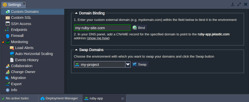 You can set a custom domain name for your Ruby application, replacing the default one. Depending on the environment topology, you should follow one of the following methods: