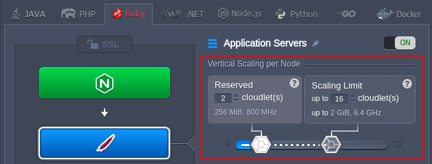 A vital feature of the platform is its dynamic provisioning of the resources (RAM and CPU) your nodes need, based on the current load, with no manual intervention required. Set the desired cloudlets limit (128 MiB of RAM and 400 MHz of CPU each) for your Ruby application server, and the platform will automatically manage everything else.