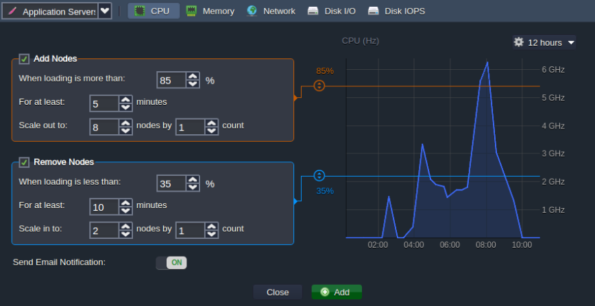 - >> Auto Horizontal Scaling section, and select the desired layer and resource to be monitored (CPU, RAM, Network, Disk I/O, Disk IOPS).