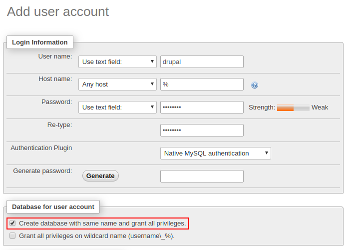 3. In the displayed form, enter the User name (e.g., drupal) and Password. Check the box "Create the database with the same name and grant all privileges," and then proceed by clicking the Go button located at the bottom.
