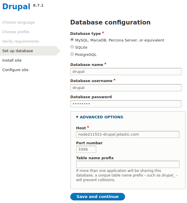 7. Click the "Save and Continue" button to proceed with the automatic installation of the Drupal CMS.
