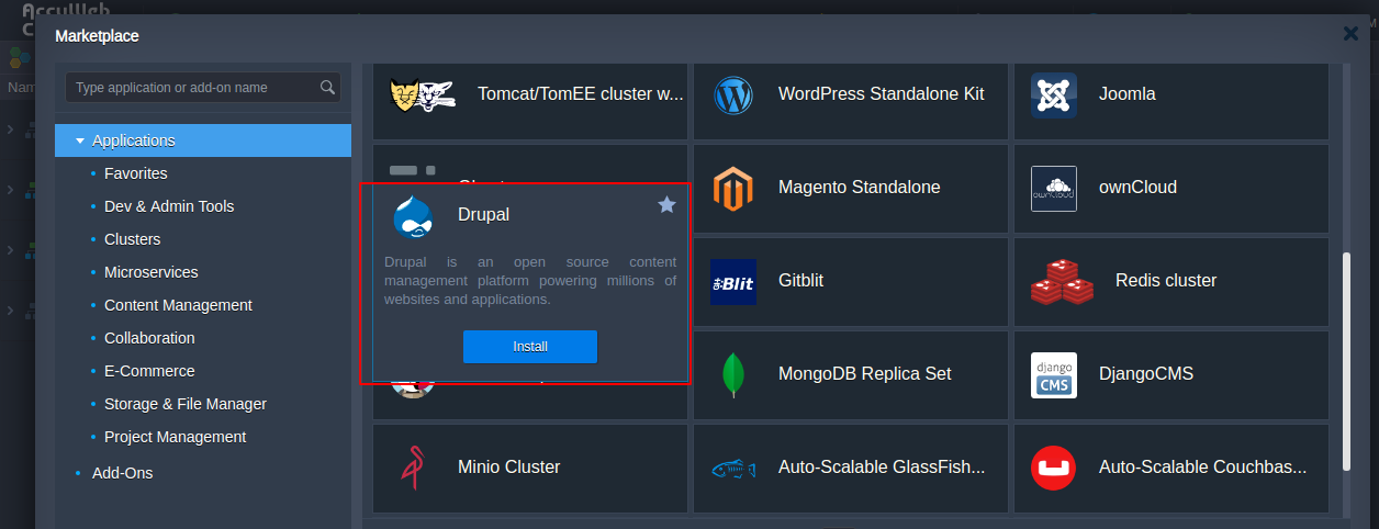 Users who are already registered can install Drupal directly from the Marketplace within their dashboard.