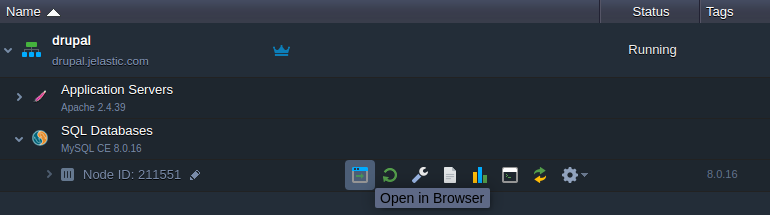 - Click on "Open in Browser" next to the database node (for example, MySQL).