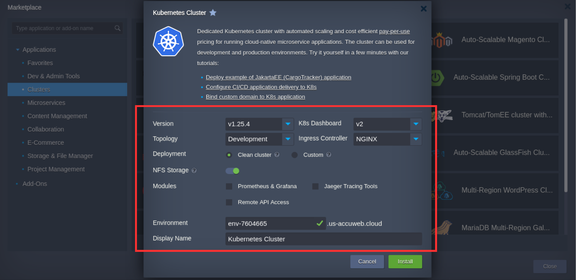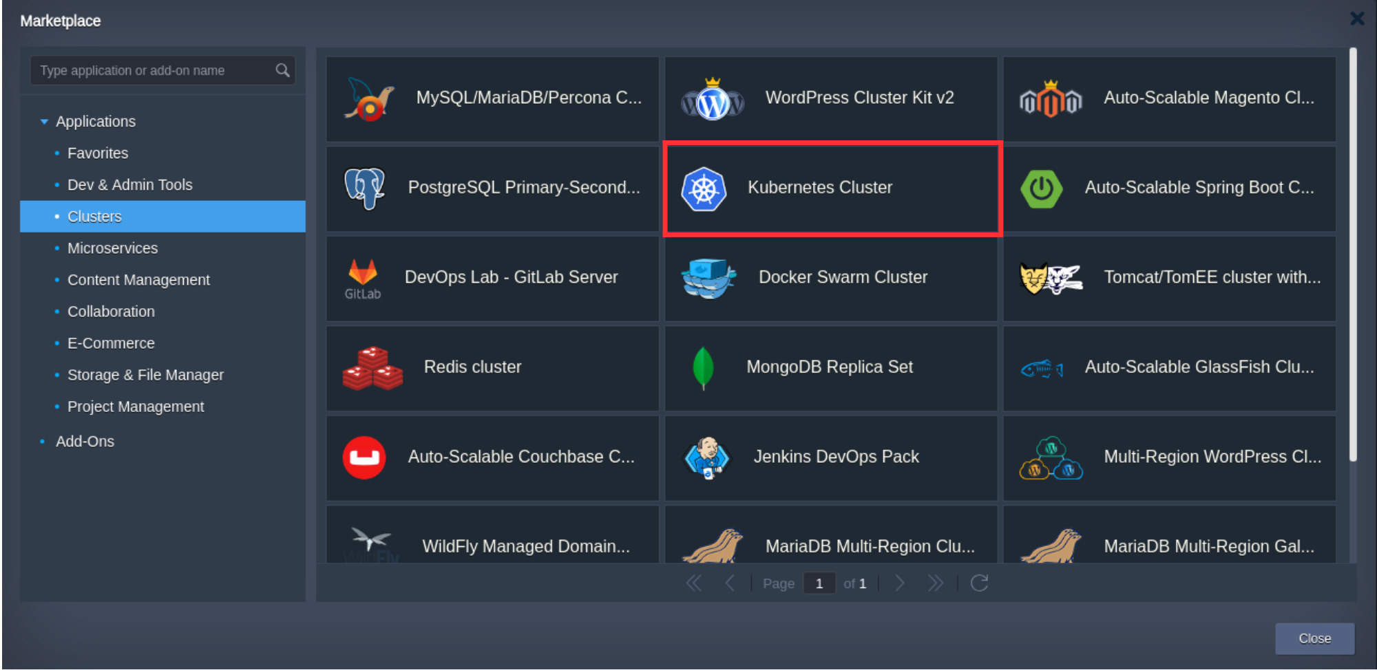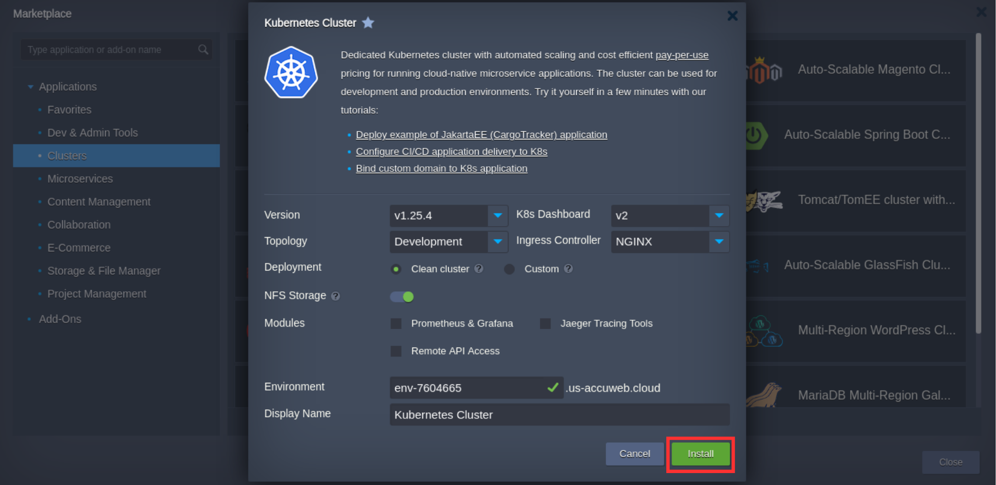 - One-Click Installation - Get a complete Kubernetes environment up and running in minute from ready to use marketplace