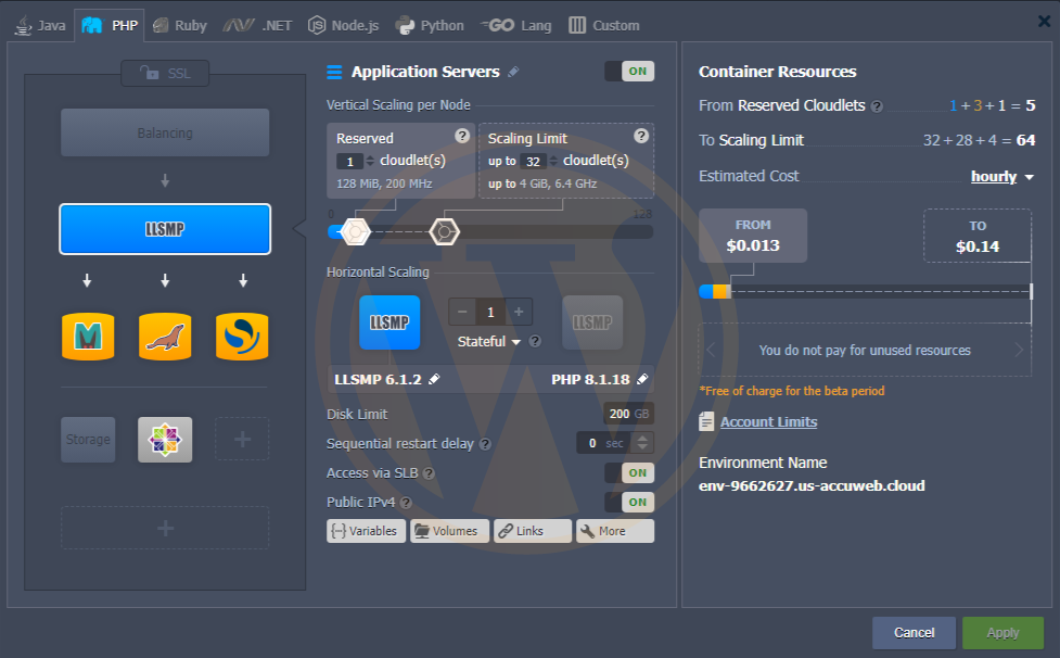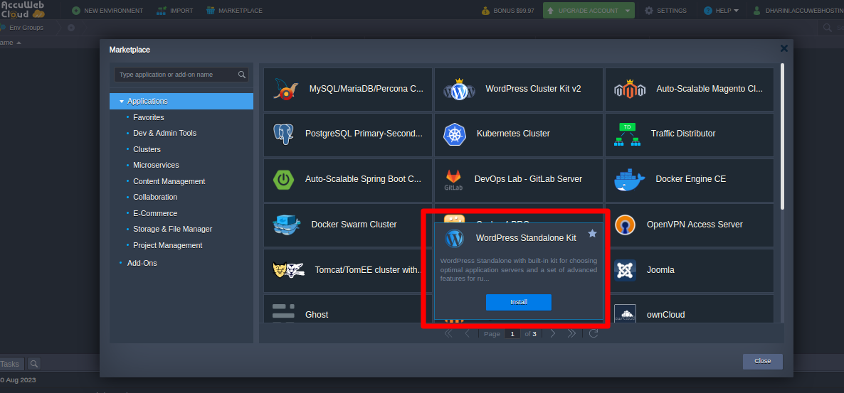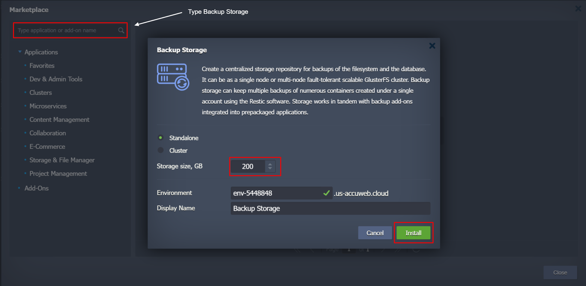 You can easily install backup storage from our ready-to-use marketplace. Add backup from the add-on option in your environment and enable the Backup Add-On for the WordPress application. This Add-on allows you to configure daily, monthly, weekly, and hourly backups.