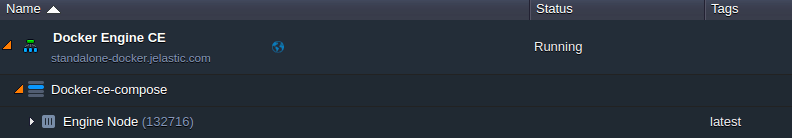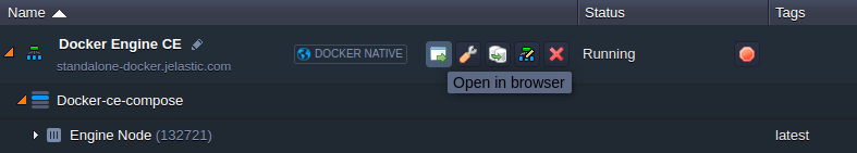 Our illustrative Swarm cluster currently comprises 3 Manager nodes(indicated by the relevant statuses in the final column) and 6 Worker containers. One of these containers operates in an environment with a distinct domain name, as it was externally added through our Docker Engine CE solution.