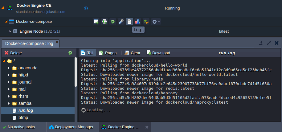 - If the deployed project doesn't incorporate a built-in graphical user interface, you can access deployment details directly from the dashboard to confirm the successful installation. To do so, review the logs, particularly the "run.log" file: