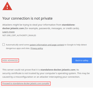 The steps required for these actions can vary depending on your browser. For instance, in Google Chrome, you must expand the Advanced section and click the Proceed to {env_URL} link.